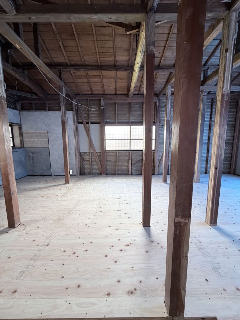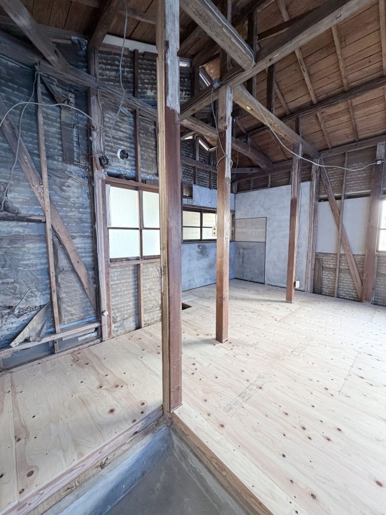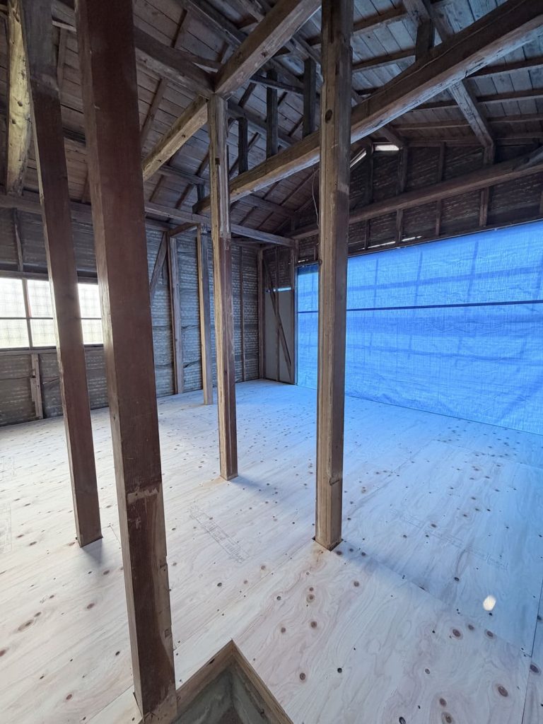 構造の関係で、当初予定していた土間仕上げではなく、新たに木下地を組んでフラットな床仕上げへ変更しました。