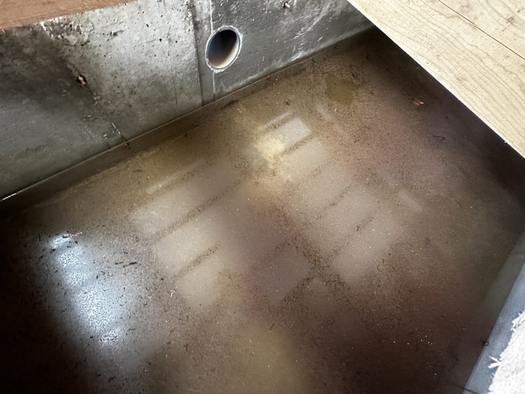 管理会社様からの引き継ぎでは「水抜き済み」と伺っていましたが、実際に床を開けてみると、まだ水が溜まった状態でした。